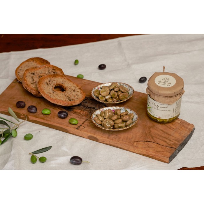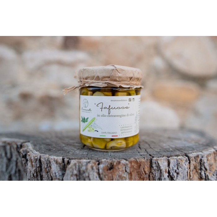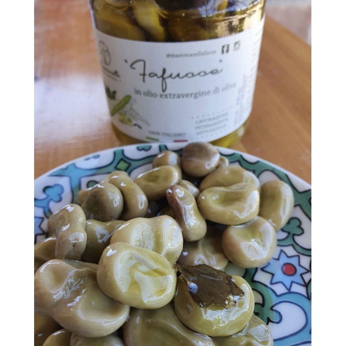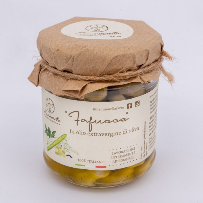Deliziose e tenerissime fave fresche piccolissime sgranate a mano una ad una, eliminando il peduncolo che le lega al baccello per renderle ancora più dolci. Sono poi scottate in aceto, invasettate e conservate in olio extra vergine di oliva “Gentile di Larino” con l’aggiunta di pepe in grani e alloro.